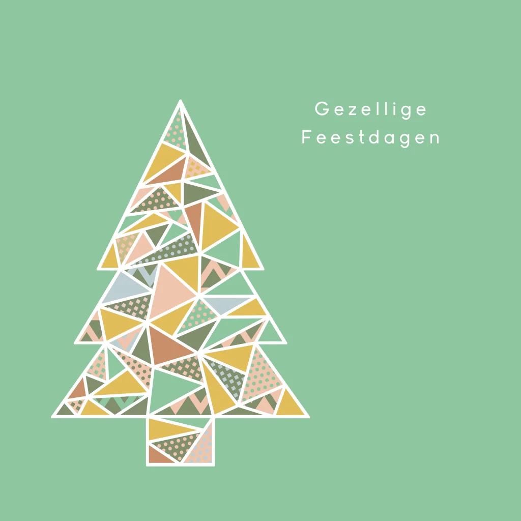 Moderne kerstkaart met een geometrische kerstboom in zachte pastelkleuren. De strakke lijnen en grafische patronen geven de kaart een eigentijdse uitstraling. Perfect voor wie houdt van simpel design met een speelse twist.