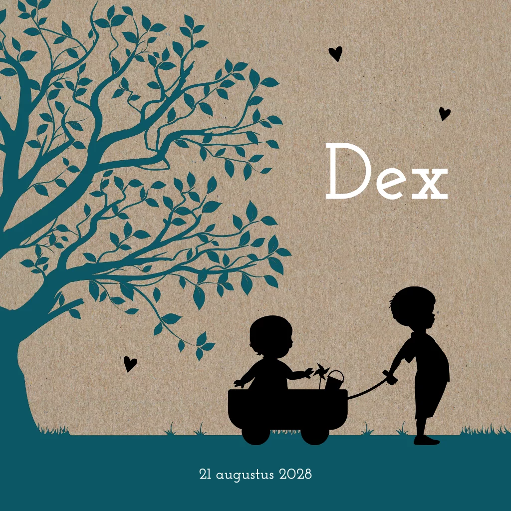 Op dit leuke geboortekaartje voor een 2e kind zie je een silhouet illustratie van twee broertjes die onder een grote boom staan. Dit kaartje wordt gedrukt op echt kraftpapier. De kleuren en teksten zijn gemakkelijk aan te passen via onze editor. Ook kan je nog nieuwe elementen toevoegen. Is je ontwerp naar wens? Dan kan je een proefdruk bestellen om het resultaat alvast in het echt te zien.