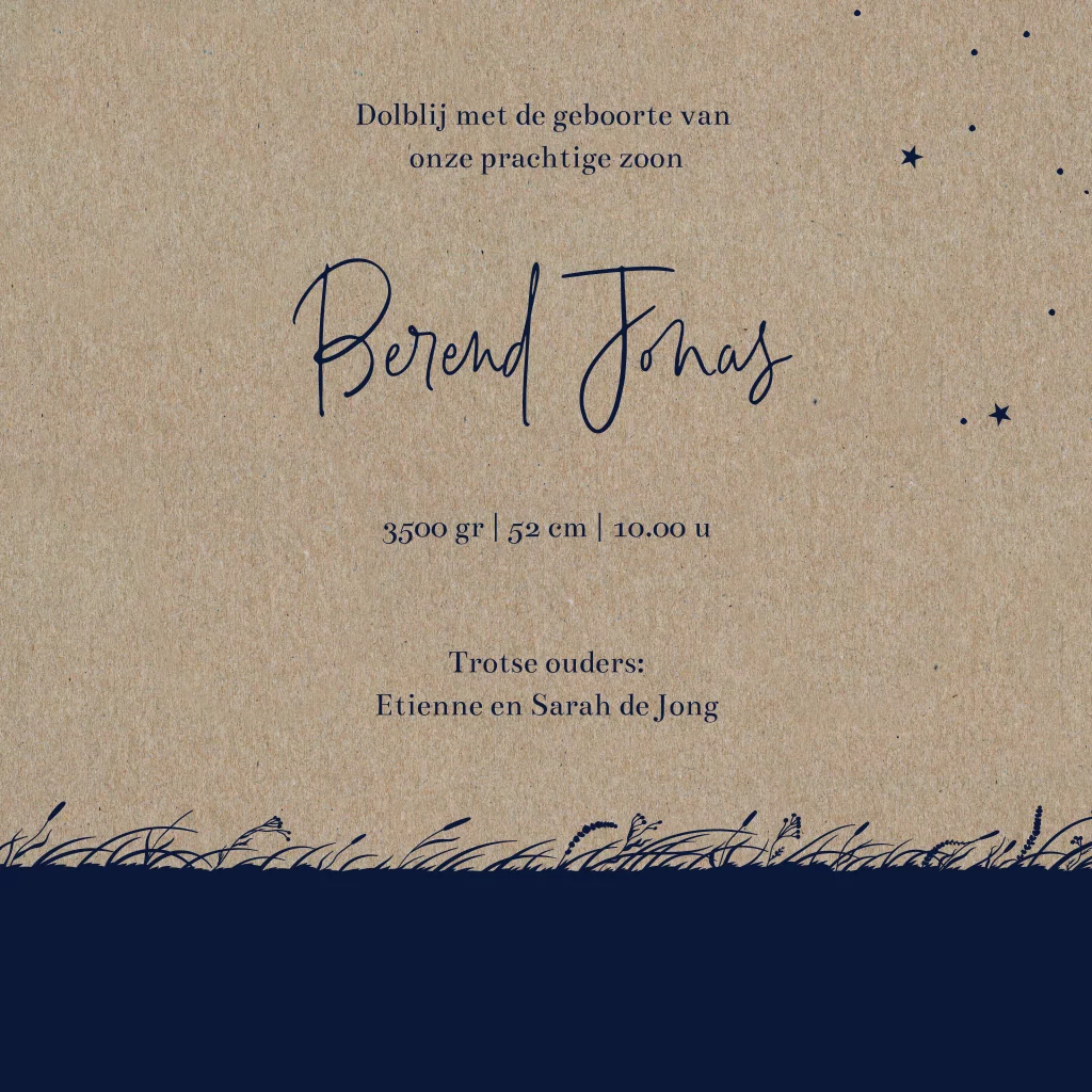 Een kraft geboortekaartje met twee silhouetjes van een grote en kleine beer. Samen staan ze voor een grote maan en worden ze omringd door kleine sterretjes. De naam van je zoontje komt in sierlijke typografie bovenaan. Aan de binnenzijde komen de beren terug, dit keer zit de baby beer bovenop de rug van papa of mama beer. Plaats een lieve quote erbij en personaliseer dit kaartje in onze ontwerptool.