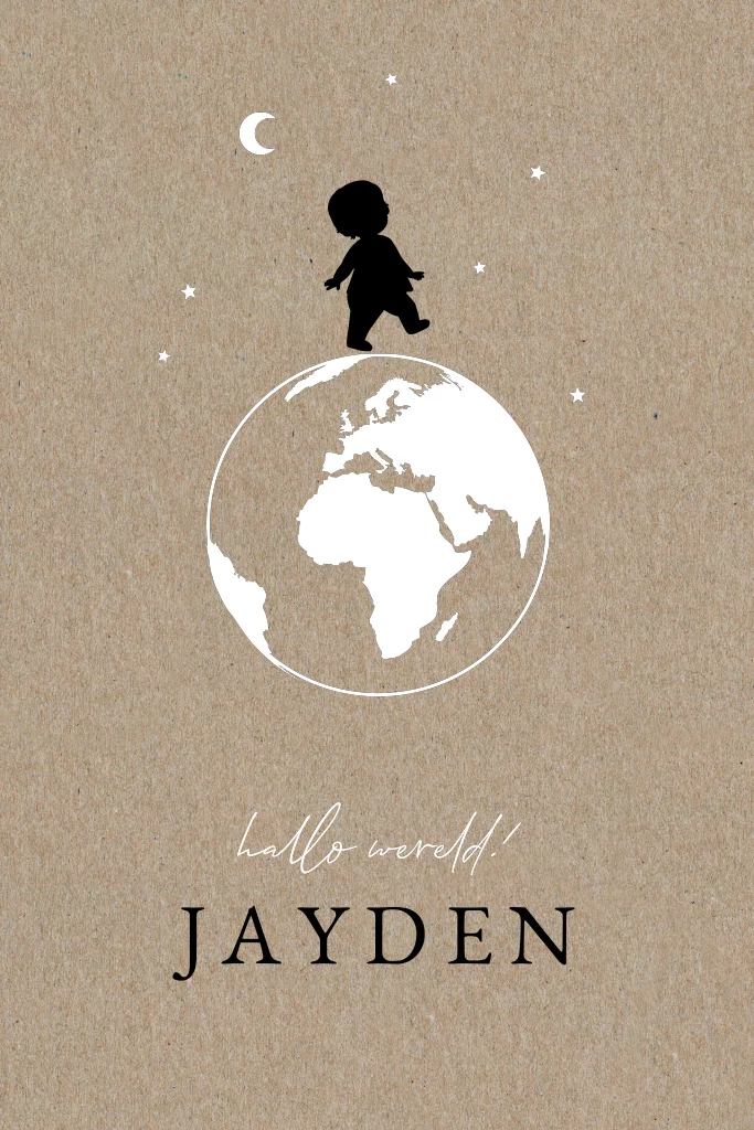Leuk geboortekaartje van kraftpapier met silhouetje op wereldbol, sterretjes en maantje. De naam van je kindje komt in zwarte letters onderaan. Op de achterzijde komt het silhouetje terug. De witte en zwarte opdruk combineren erg mooi met de kraft ondergrond. Pas dit kaartje naar eigen wens aan.