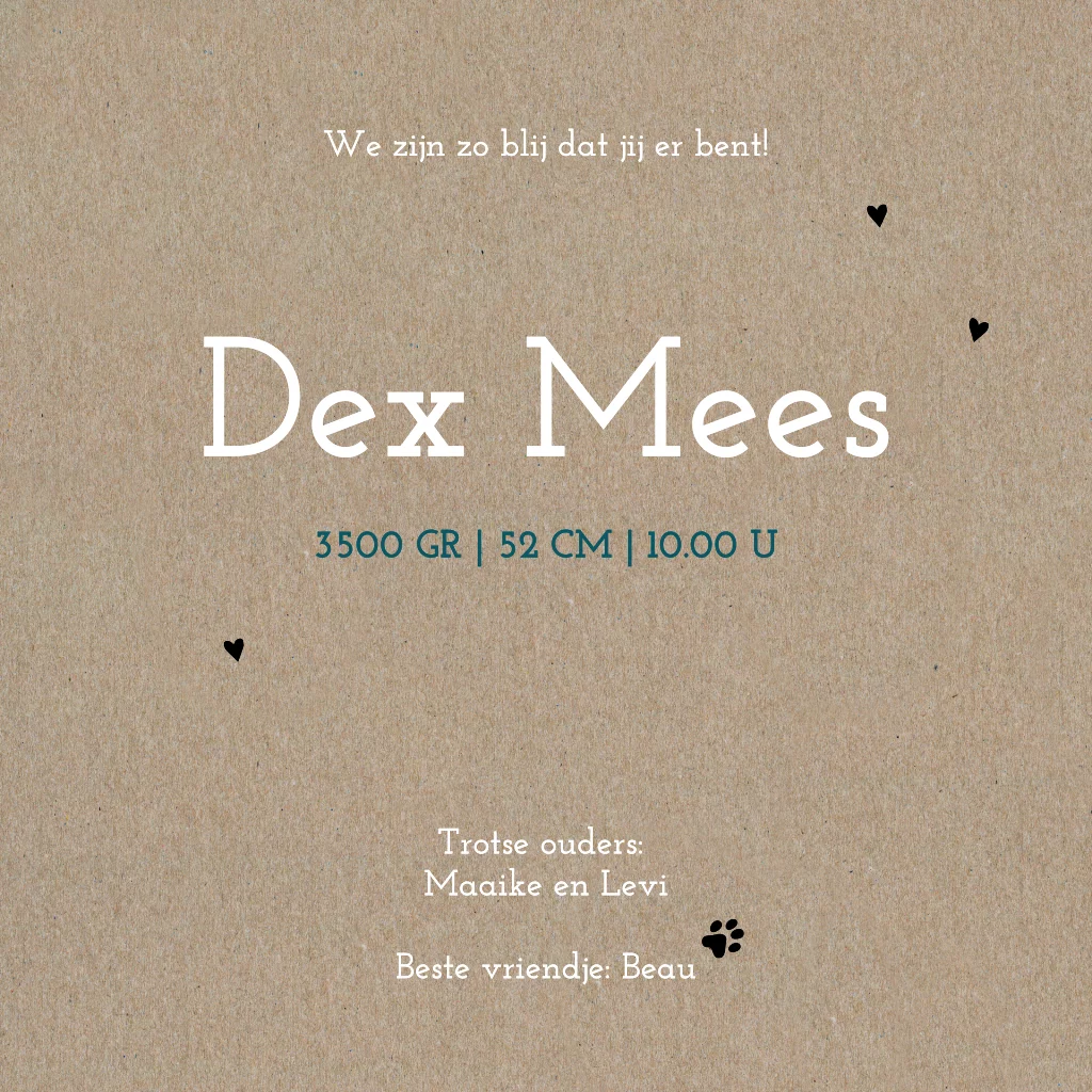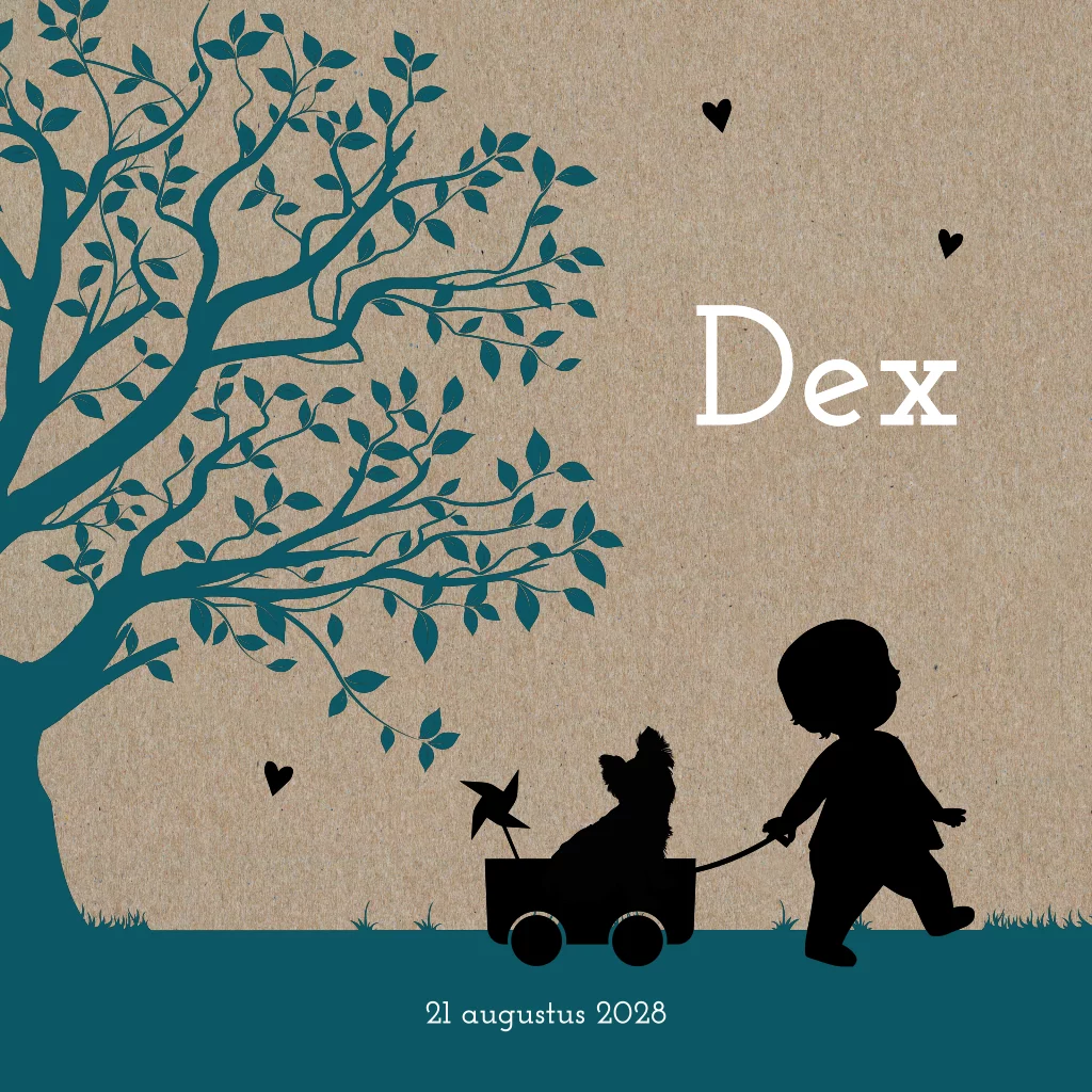 Origineel geboortekaartje met silhouet illustratie van een jongen met zijn hondje in een karretje bij een boom. Dit kaartje wordt gedrukt op echt kraftpapier. De kleuren en teksten zijn gemakkelijk aan te passen via onze editor. Hebben jullie een andere hond? Kijk in de editor bij de map "silhouet honden'. We hebben heel veel verschillende honden toegevoegd.