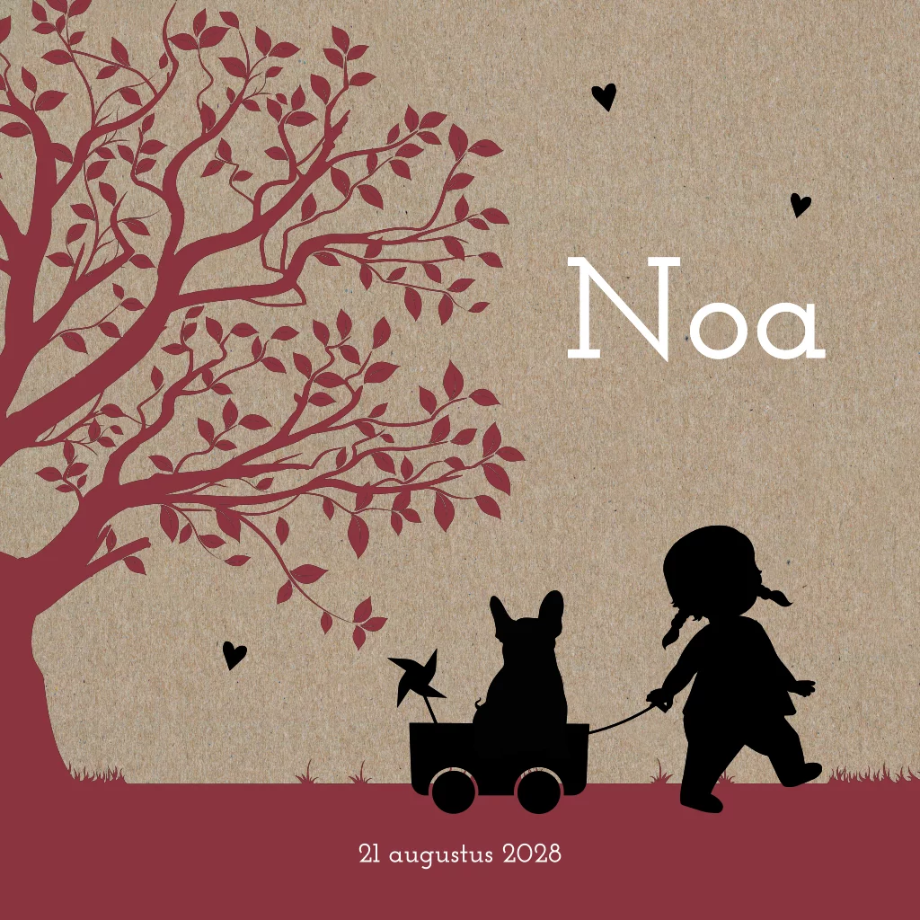Superleuk geboortekaartje met een silhouet illustratie van een meisje met haar hondje in een karretje bij een grote boom. Dit kaartje wordt gedrukt op echt kraftpapier. De kleuren en teksten zijn gemakkelijk aan te passen via onze editor. Hebben jullie een andere hond? Kijk in de editor bij de map "silhouet honden'. We hebben heel veel verschillende honden toegevoegd.