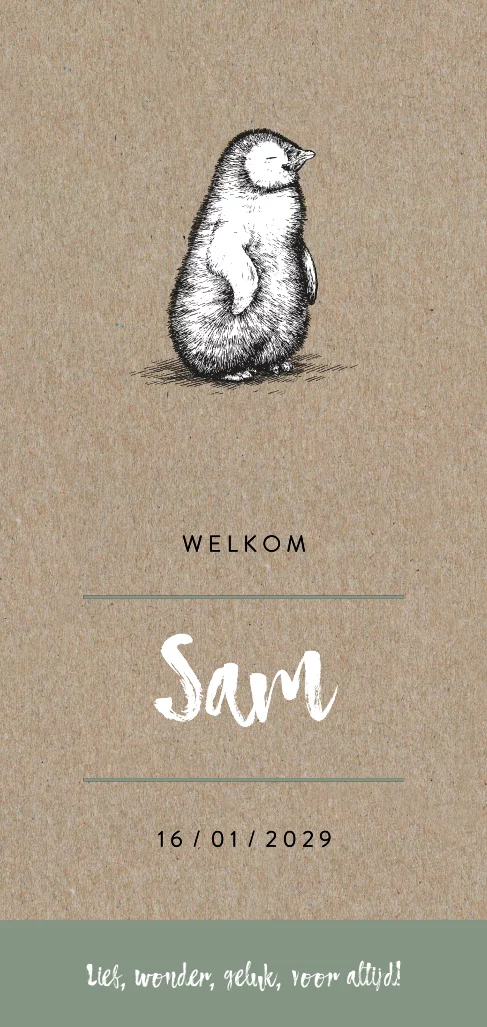 Grijsgroen geboortekaartje met een getekende pinguïn op echt kraft. Dit stoere winter geboortekaartje is perfect om de geboorte van je zoon mee aan te kondigen. Het ontwerp bevat een schattige pinguïn in zwart / wit wat mooi afsteekt op het kraft papier. Op de achterzijde staat de pinguïn weer en kun je alle gegevens van je kleine knul plaatsen. Vergeet geen proefdruk te bestellen, zodat je weet hoe het kaartje er uit komt te zien.