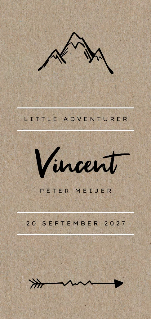 Is er een kleine avonturier op komst? Kondig zijn geboorte aan met dit stoere geboortekaartje van kraftpapier met kleine bergjes. De kaart is strak opgemaakt in alleen zwart en wit, wat mooi afsteekt op de kraft ondergrond. Pas dit ontwerp zelf aan in onze ontwerptool.