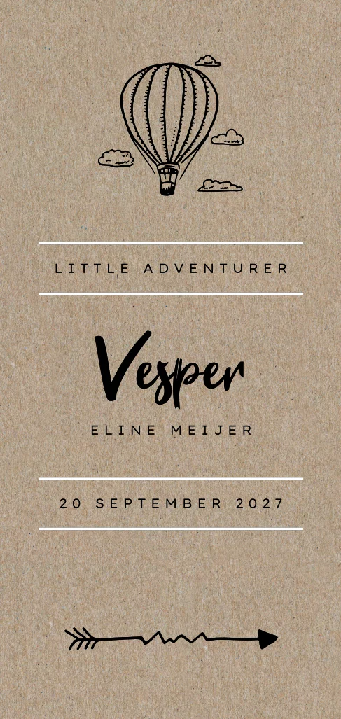Kondig de komst van je kleine avonturier aan met dit leuke kraft kaartje met wolkjes en een luchtballon! Een strakke opmaak in alleen zwart en wit maakt dit tot een stoer ontwerp. Pas de kaart eventueel aan naar eigen smaak in onze ontwerptool.