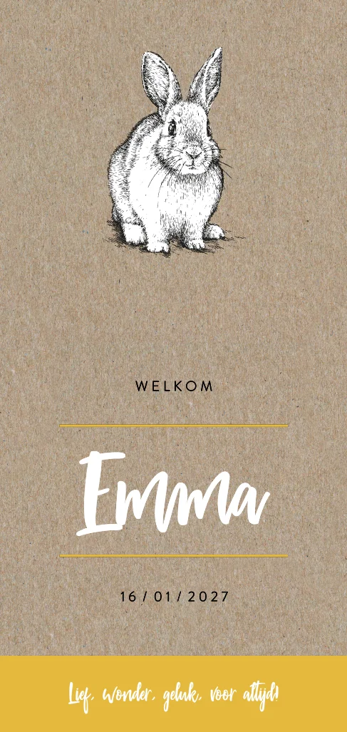 Kraft geboortekaartje met een getekende konijn gedrukt op echt kraftpapier. Stoer geboortekaartje om de geboorte van je dochter mee aan te kondigen. Het ontwerp bevat een schattige konijn in zwart / wit wat mooi afsteekt op het kraftpapier. Op de achterzijde staat het konijn weer en kun je alle gegevens van je kleine meid plaatsen. Vergeet geen proefdruk te bestellen, zodat je weet hoe het kaartje er uit komt te zien.