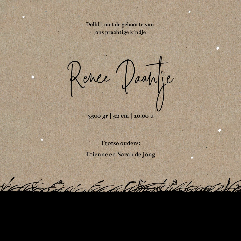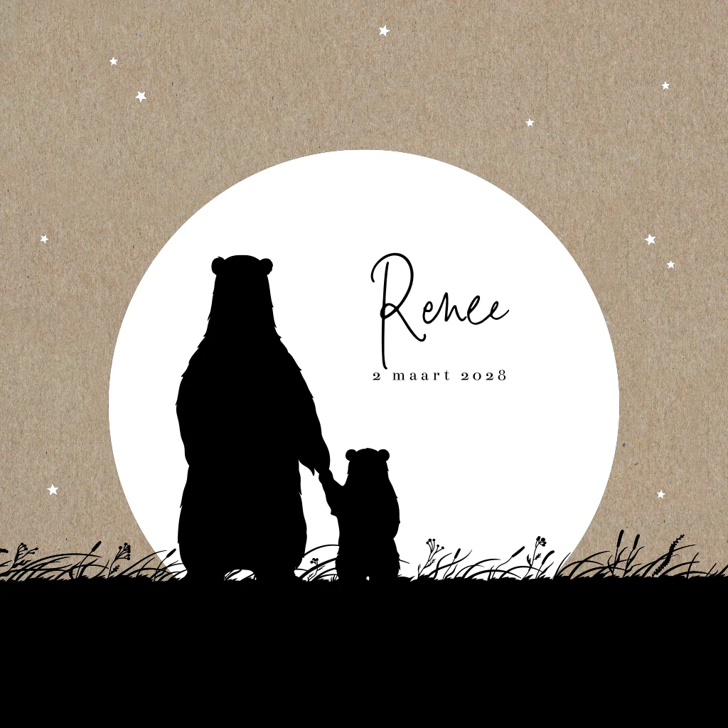 Kondig de komst van je kleintje aan met dit leuke kraft geboortekaartje met beren silhouetjes. Een grote en kleine beer staan voor een witte maan en een sterrenhemel van kleine, witte sterretjes. Aan de binnenzijde is ruimte voor een lieve quote of gedichtje. Maak dit kaartje af door er je eigen draai aan te geven in onze handige ontwerptool.
