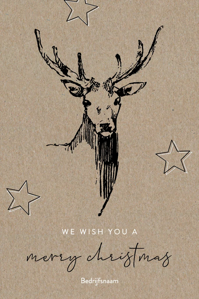 Warme kerstgroeten met een prachtige afbeelding van een edelhert in zwart-wit op rustiek bruin kraftpapier. Stuur deze sfeervolle kerstkaart naar al je zakelijke connecties en wens hen een vreugdevolle feestperiode toe. Pas de kerstkaart naar eigen inzicht aan en bestel daarna een drukproef om te zien hoe het eindresultaat wordt.