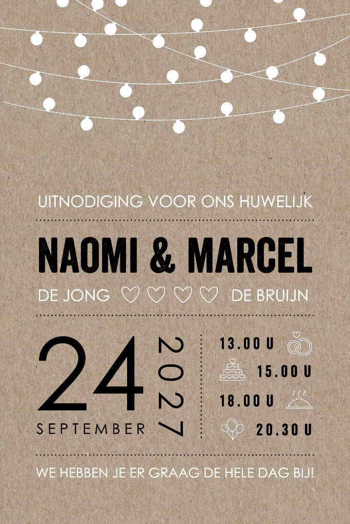 Ben je nog op zoek naar een hippe trouwkaart om al je gasten mee uit te nodigen op jullie bruiloft? Wat vind je van deze trouwkaart gedrukt op echt kraft papier? De witte lampjes en tekst steken mooi af op het kraft. Je kunt zelf alle gegevens aanpassen. Vraag een drukproef aan van jouw aangepast kaart. Zo zie je hoe de kaart in het echt wordt.