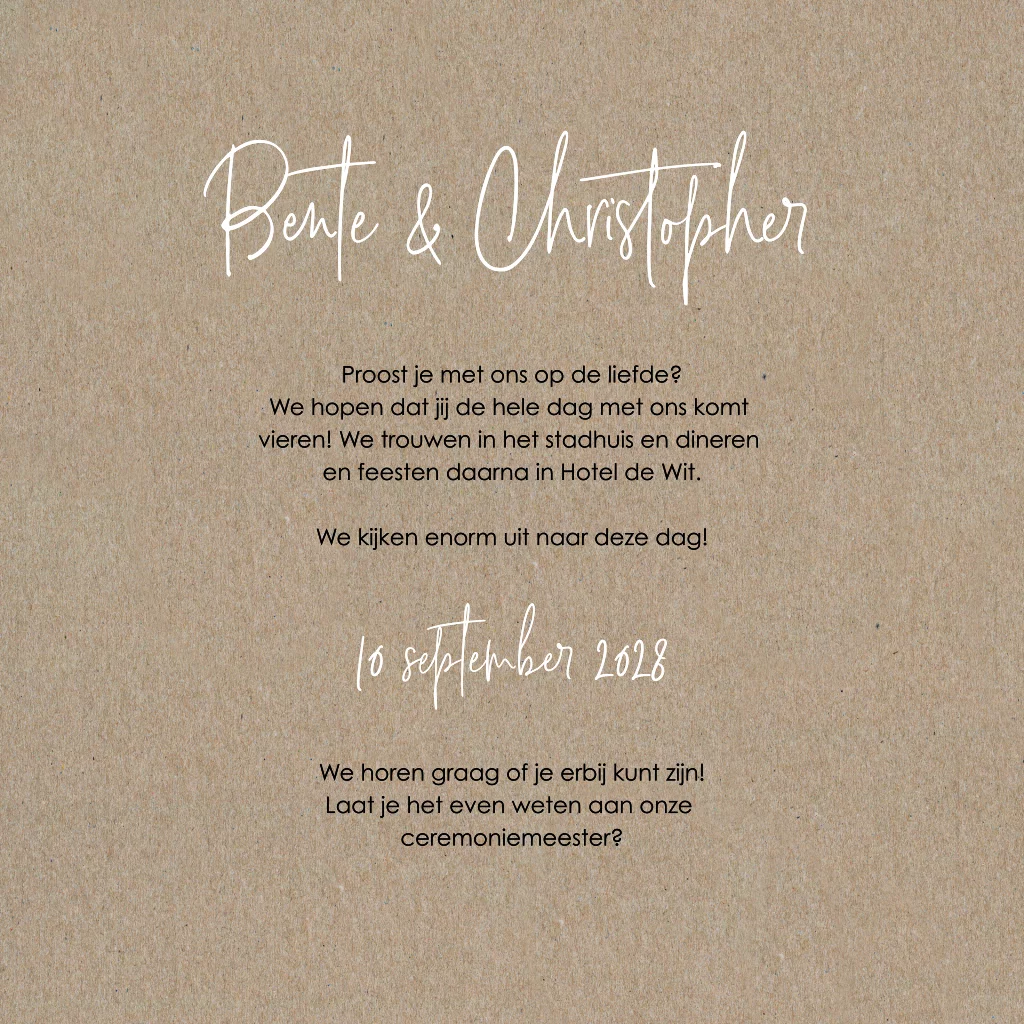 Een minimalistische trouwkaart met trouwlogo en initialen in zwartwit. Deze kaart wordt op écht kraftpapier gedrukt en dat maakt het meteen tot een originele uitnodiging. De zwartwitte opdruk past mooi bij het stoere kraftpapier. Voorop komen jullie initialen en trouwdatum te staan, aan de binnenzijde van dit vierkante ontwerp kun je alle informatie over de bruiloft kwijt. Pas dit ontwerp zelf aan in onze editor.
