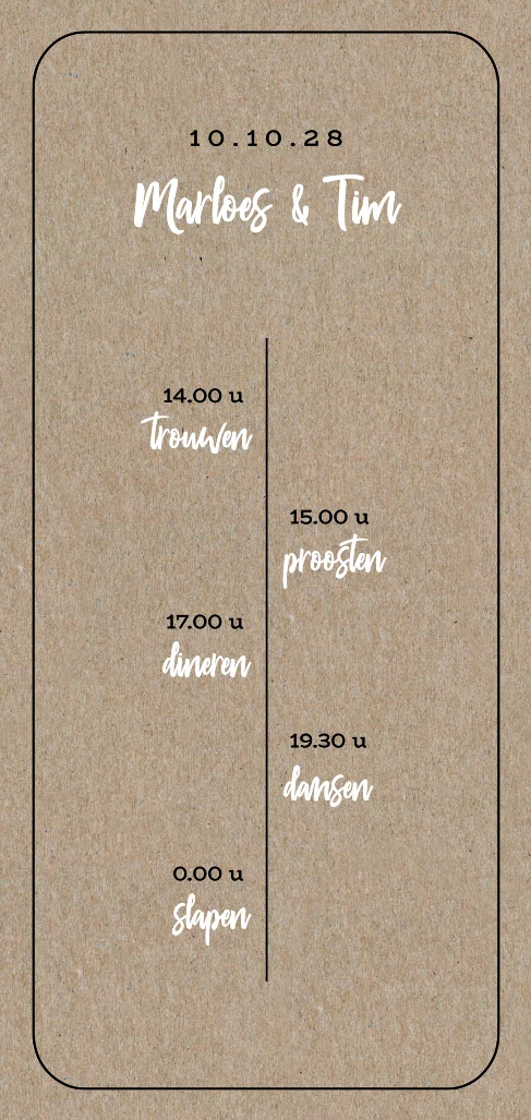 Kraftpapier trouwkaartje met tijdlijn en zwart/witte opdruk. Dit strakke kaartje wordt gedrukt op écht kraftpapier, dat maakt het meteen een unieke manier om al jullie gasten uit te nodigen. Op de voorzijde wordt een tijdlijn gedrukt van jullie bruiloft. Personaliseer deze eenvoudig in onze handige editor. Kies eventueel andere lettertypes of kleuren en geef je eigen draai aan dit originele kaartje.