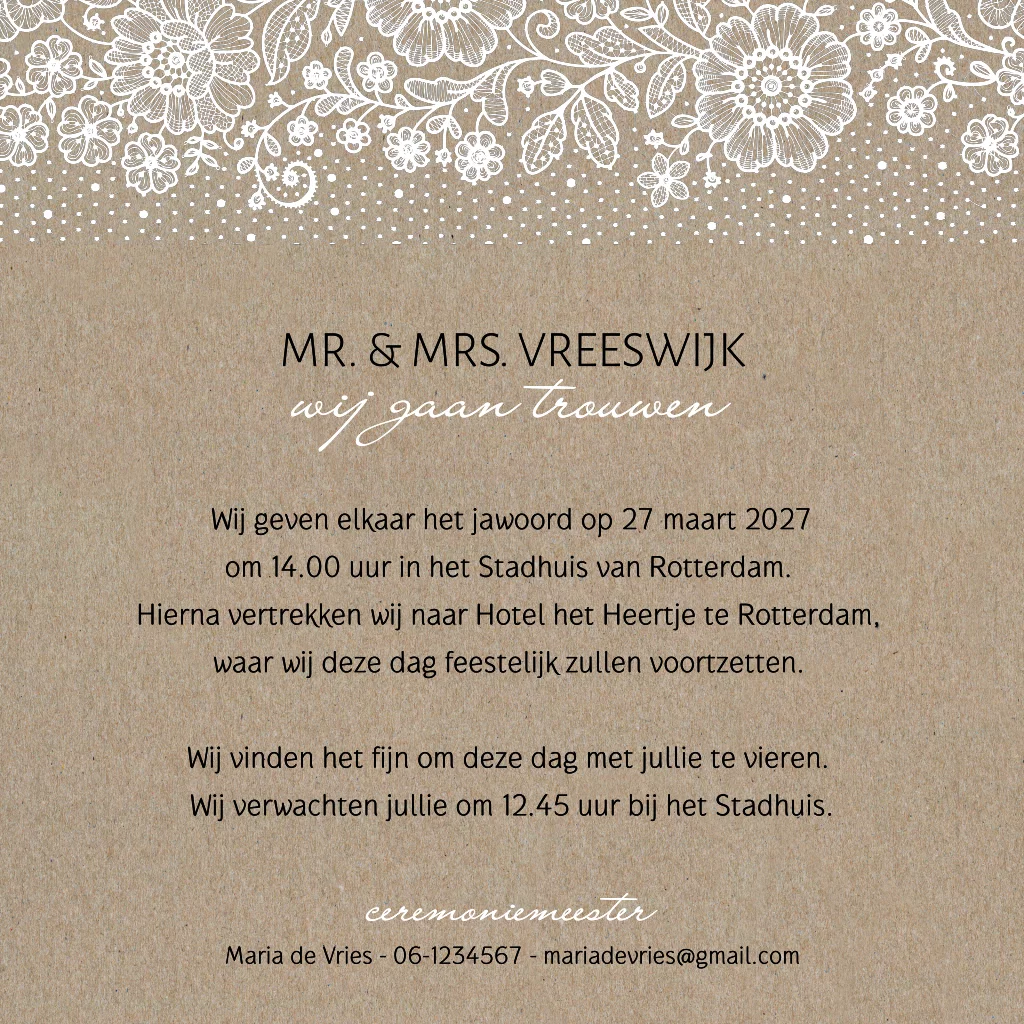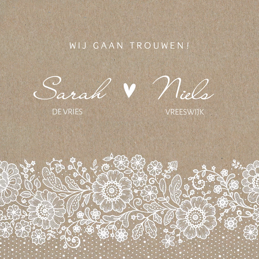 Klassieke trouwkaart met witte strook kant op bruin kraftpapier. Pas het ontwerp naar wens aan in de ontwerptool.