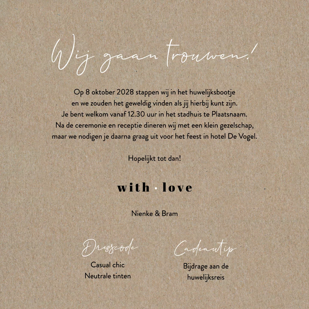 Ja! Jullie gaan trouwen! Nodig al jullie gasten uit met dit minimalistische trouwkaartje van écht kraftpapier. In een sierlijk lettertype komt voorop groot 'Yes' te staan. Onderaan is ruimte voor jullie trouwdatum. Deze trouwuitnodiging heeft een stoere en strakke look door het kraftpapier in combinatie met de zwart/witte opdruk.