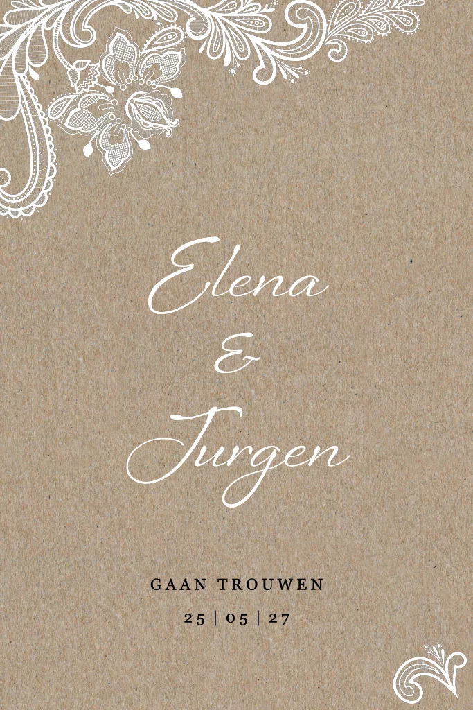 Stijlvolle trouwkaart gedrukt op bruin kraftpapier met illustratie van wit kant. Het kraft met de witte kanten bloemen geeft een mooie klassieke uitstraling. Op de achterzijde komen de kanten bloemen met bladeren terug. Pas zelf alle teksten aan en bestel een drukproef om te zien hoe deze kaart uitpakt op kraftpapier.