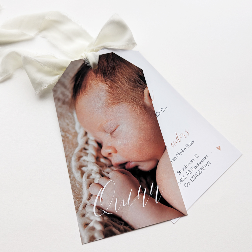 Dit geboortekaartje bestaat uit twee kaartjes in de vorm van een label, deze kun je zelf aan elkaar bevestigen met een lintje, touwtje of splitpen. Pas dit ontwerp zelf aan in onze handige editor.