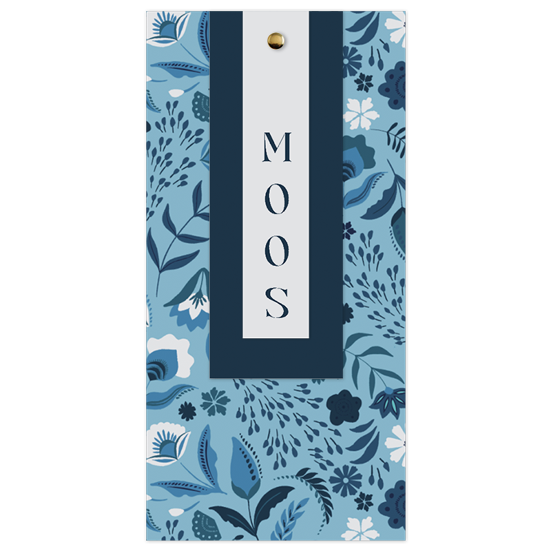 Een blauw geboortekaartje met verschillende labels en bohemian bloemenpatroon. Op het kleinste labeltje komt de naam van je zoontje in grote letters.