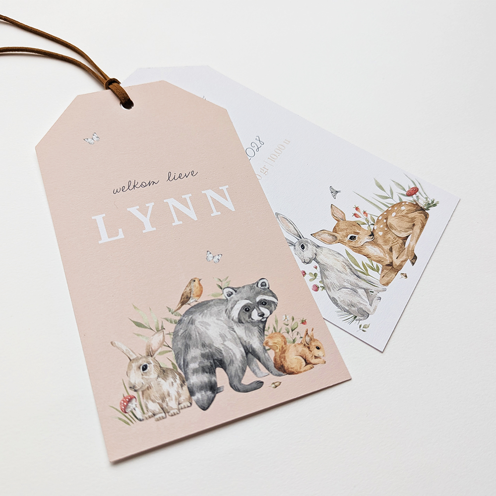 Op zoek naar een lief en origineel geboortekaartje voor je aanstaande dochtertje? Ga voor dit ontzettend schattige ontwerp met waterverf illustraties van verschillende bosdieren. Dit geboortekaartje bestaat uit twee kaartjes in de vorm van een label, deze kun je zelf aan elkaar bevestigen met een lintje of touwtje. Pas dit unieke kaartje zelf aan in onze handige ontwerptool.