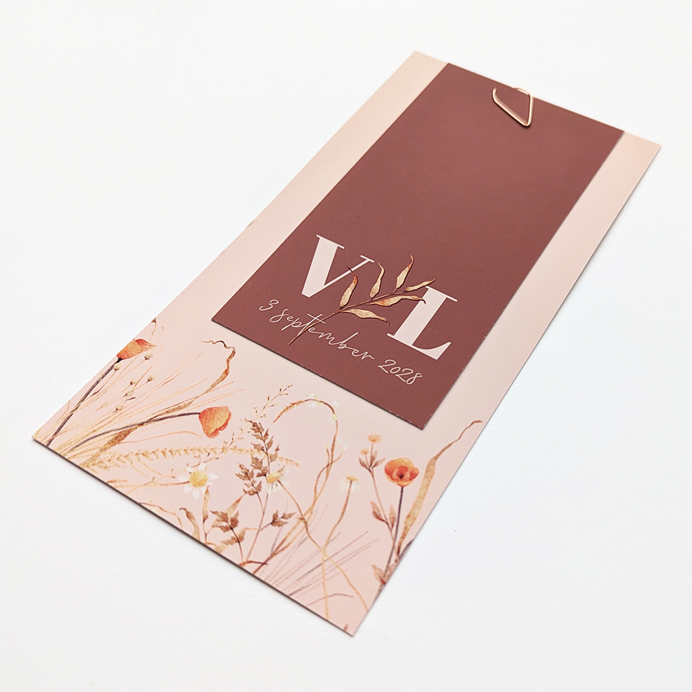 Botanische trouwkaart in warme kleuren en met label. Op het label staan jullie initialen in een opvallend lettertype. De zachtroze en bruine kaartjes worden versierd met prachtige illustraties van bloemen. Dit bijzondere trouwkaartje bestaat uit een grotere kaart met daarbij een kleiner label. Dit label kun je zelf bevestigen met een paperclip. Wil je liever een gaatje in de kaartjes zodat je ze samen kunt binden met een touwtje of lintje? Laat het ons even weten! Pas dit ontwerp naar eigen wens aan in onze handige editor.