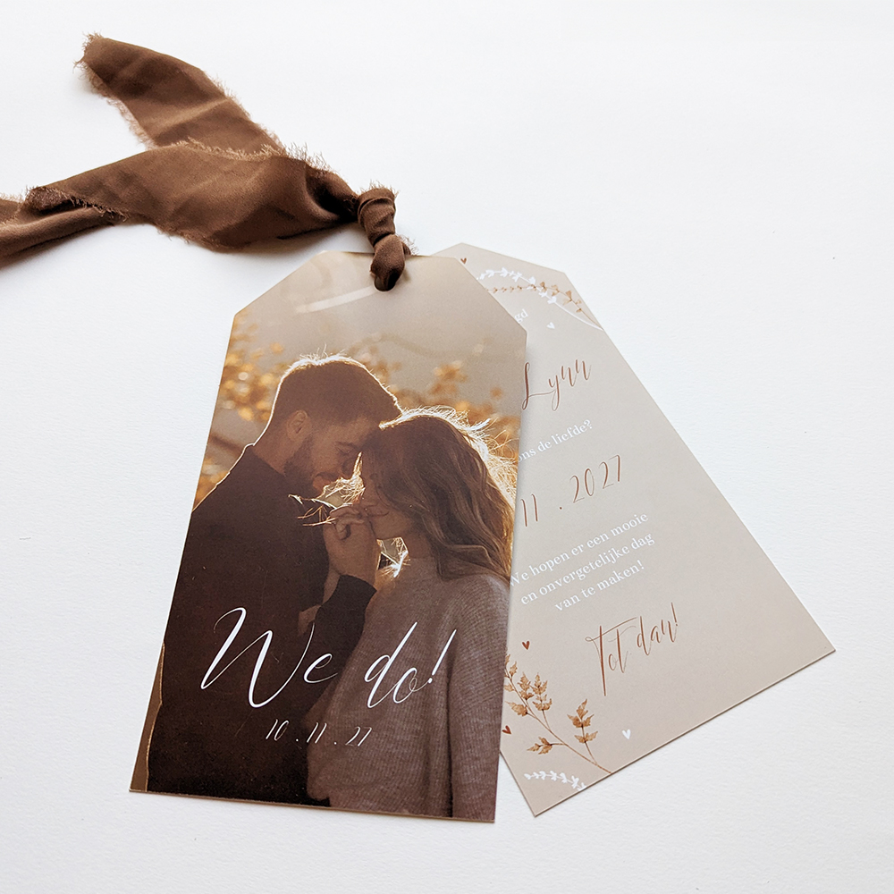 Nodig jullie gasten uit in stijl met dit originele trouwkaartje! Deze uitnodiging bestaat uit twee losse labels die bedrukt worden met een grote foto van jullie samen en alle info over jullie trouwdag in sierlijke typografie. De twee labels worden versierd met illustraties van roestbruine blaadjes.