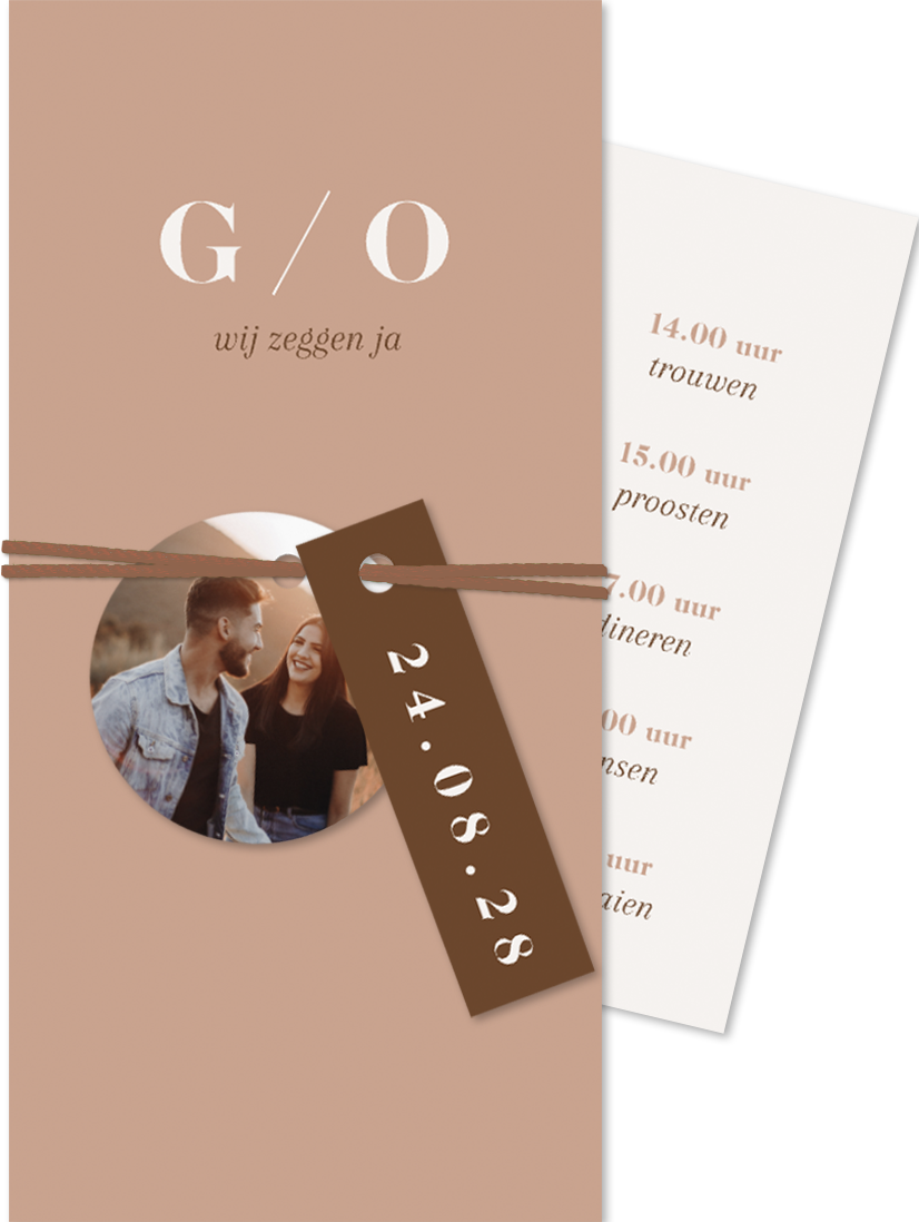 Nodig iedereen uit voor jullie trouwdag met dit unieke kaartje met losse labels. Op het ronde labeltje is ruimte voor een mooie foto van jullie samen, op het rechthoekige labeltje voor jullie trouwdatum. Het kleine losse kaartje kun je gebruiken om het dagprogramma op te plaatsen. Bevestig de labeltjes aan de grote, zachtbruine kaart met een touwtje en nodig al jullie gasten uit in stijl!