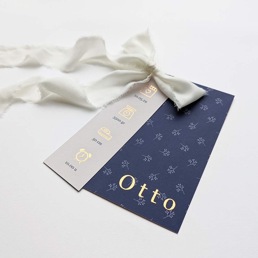 Ga voor tijdloze elegantie met dit donkerblauwe en beige geboortekaartje met kleine takjes, verfraaid met glinsterende goudfolie accenten en een charmant label. Op dit losse label is ruimte voor alle geboortegegevens van je pasgeboren zoontje. Met een zacht chiffon lintje kan dit label aan het kaartje worden bevestigd, waardoor elke aankondiging net dat beetje extra bijzonder wordt.
