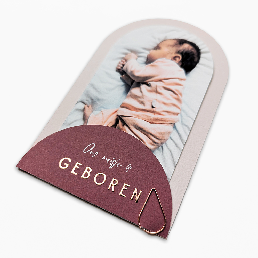 Laat de aankomst van je kleine meisje schitteren met ons unieke geboortekaartje! Bestaande uit drie losse kaartjes in zachte beige en donkerroze tinten, verbonden met een speelse paperclip. Het middelste halfronde kaartje biedt ruimte voor een prachtige foto van je dochtertje, waardoor het kaartje een persoonlijke touch krijgt. De subtiele accenten van roségoudfolie voegen een vleugje elegantie toe aan het geheel. Pas dit betoverende ontwerp naar eigen wens aan in onze editor en bestel een proefdrukje om dit ontwerp in het echt te kunnen bewonderen!