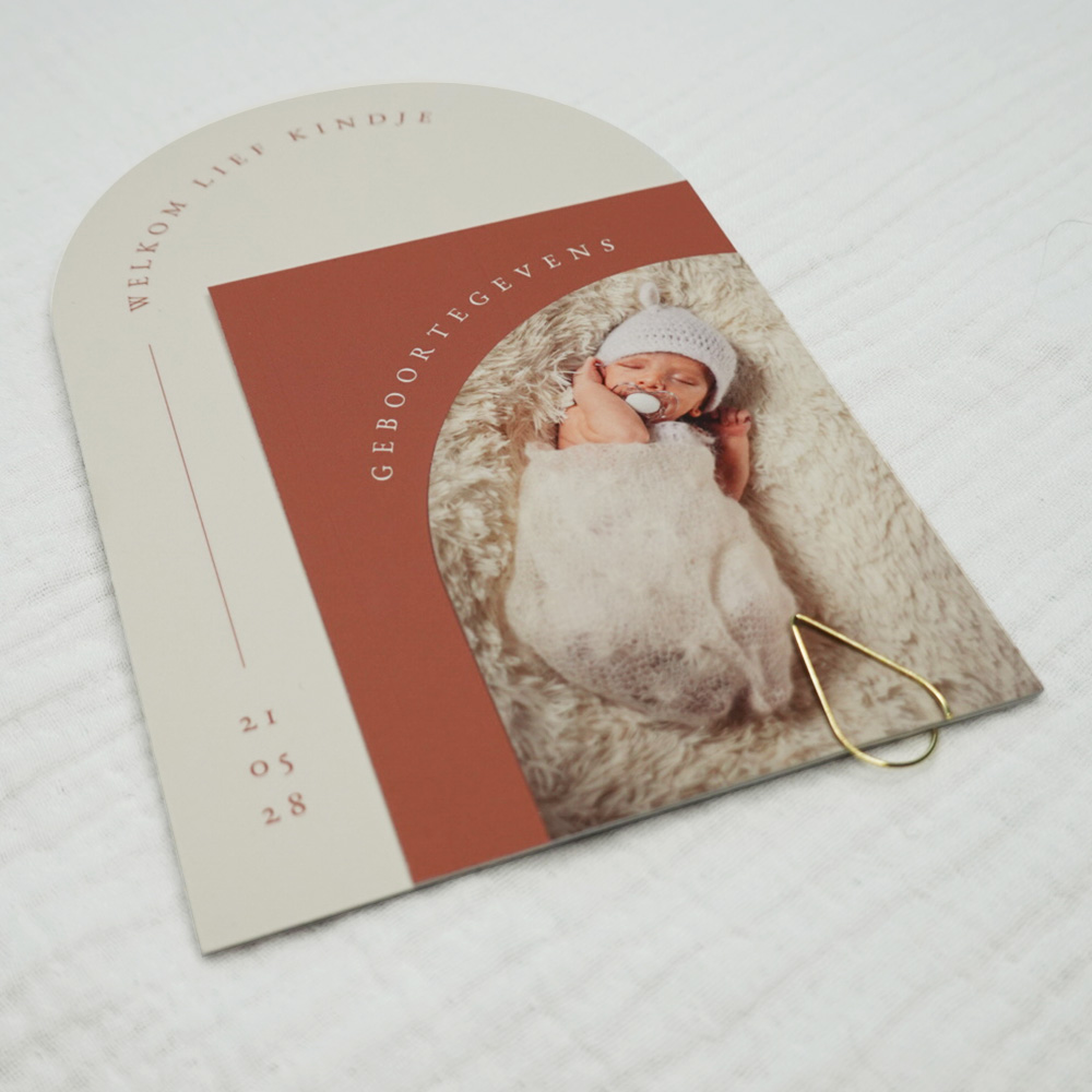 Vier de aankomst van je kleine wonder met ons unieke geboortekaartje! Ontworpen om te verrassen, bestaat dit kaartje uit drie losse delen in trendy terra en zacht beige. Met een leuke paperclip worden de kaartjes samengevoegd, waardoor jullie aankondiging niet alleen liefdevol is, maar ook nog eens origineel. Er is ruimte voor een eigen foto, voor een persoonlijke finishing touch. Maak van deze geboorteaankondiging een blijvende herinnering met dit bijzondere geboortekaartje!