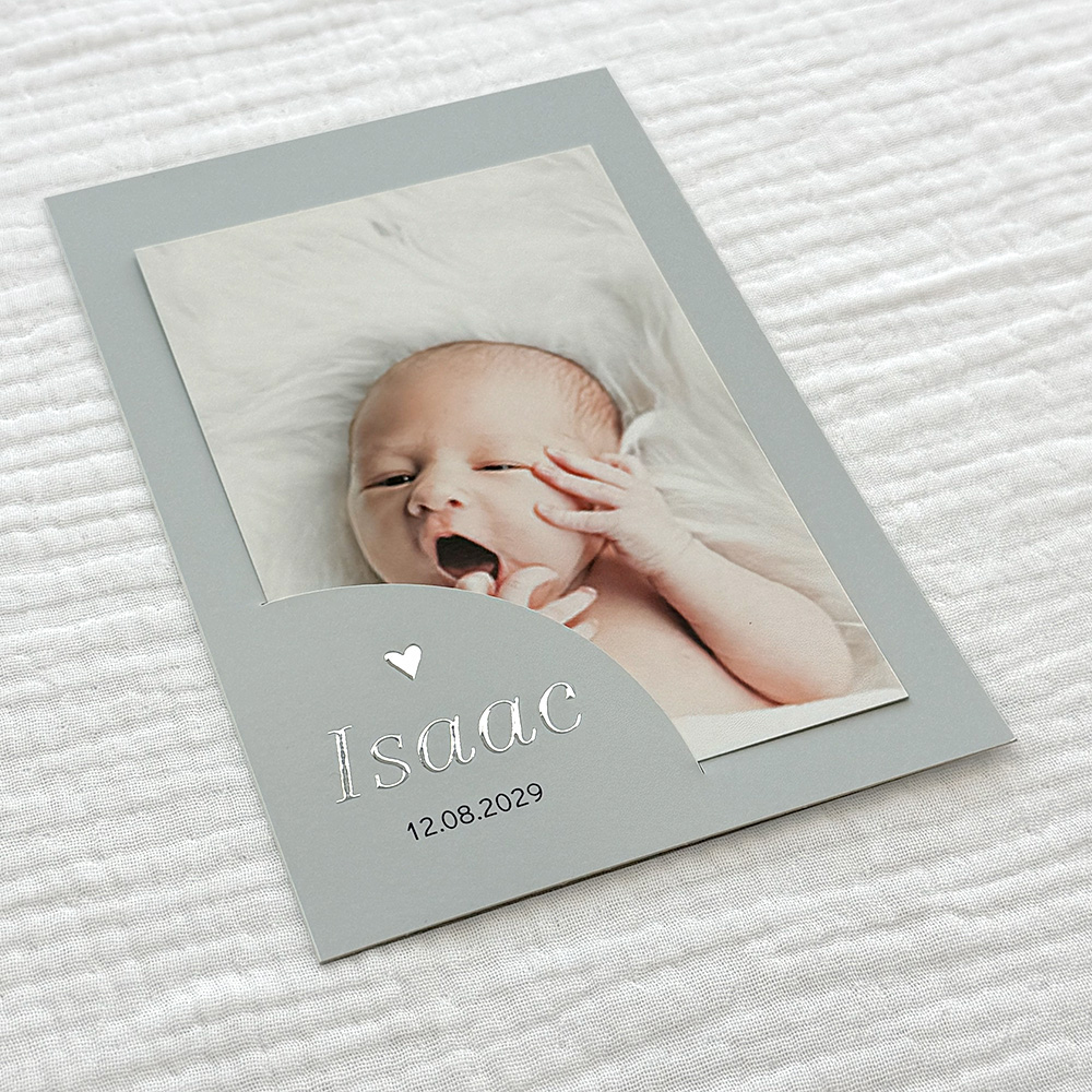 Vier de komst van jullie zoon met dit bijzondere geboortekaartje! Dit ontwerp in zachtblauw heeft een halfronde inkeping waar jullie favoriete foto van jullie pasgeboren zoontje mooi in past. De naam van jullie kleintje, prachtig weergegeven in zilverfolie, voegt een luxe touch toe aan het geheel.