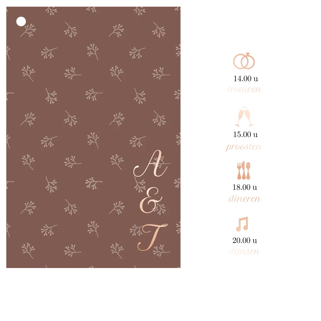 Deze moderne trouwkaart bestaat uit een stijlvolle hoofdkaart met warme bruine achtergrond en takjespatroon een bijpassend wit label waarop het dagprogramma staat. De initialen van het bruidspaar worden in luxe rosegoudfolie gedrukt, wat zorgt voor een chique uitstraling.