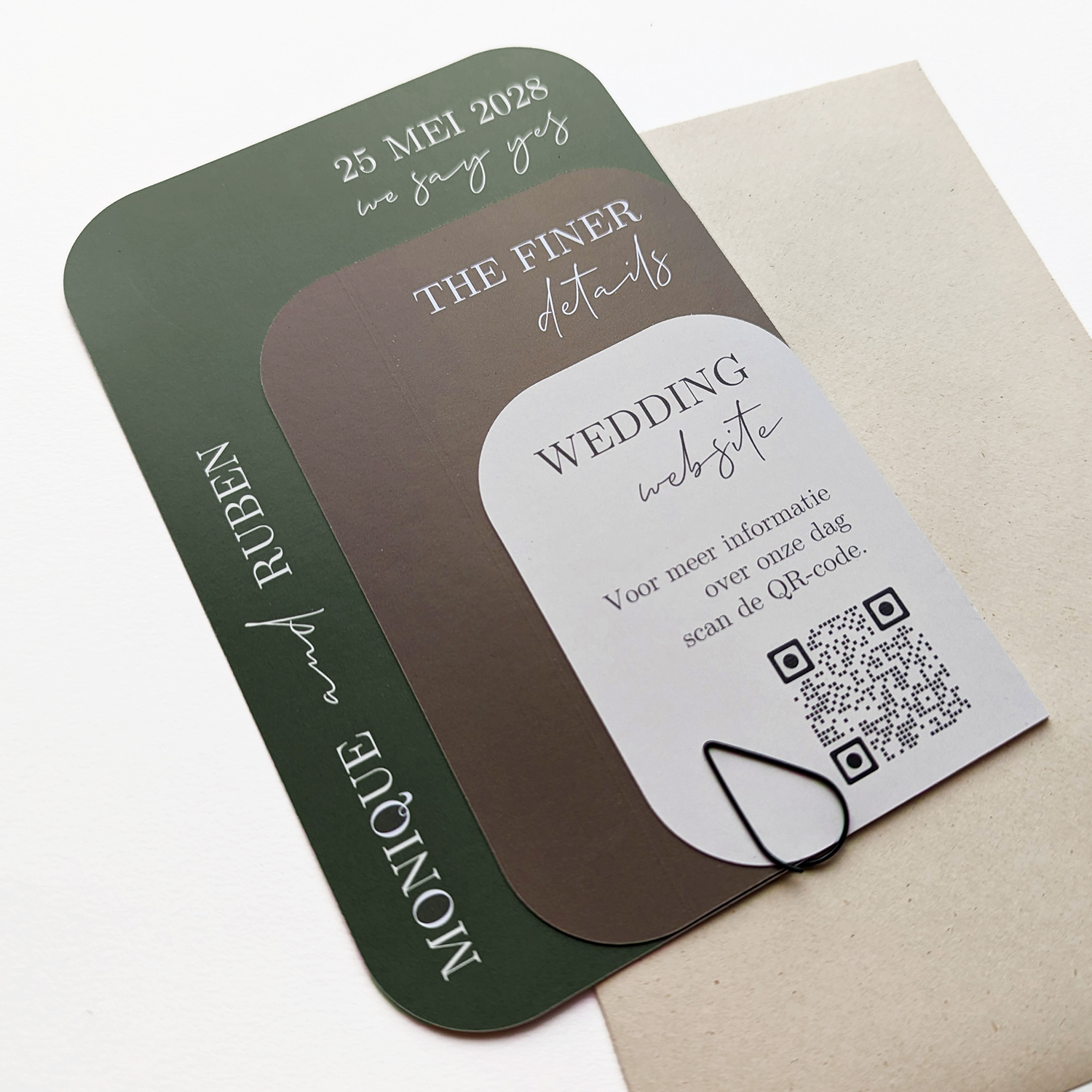Drie lagen trouwkaart met groen en bruin accenten