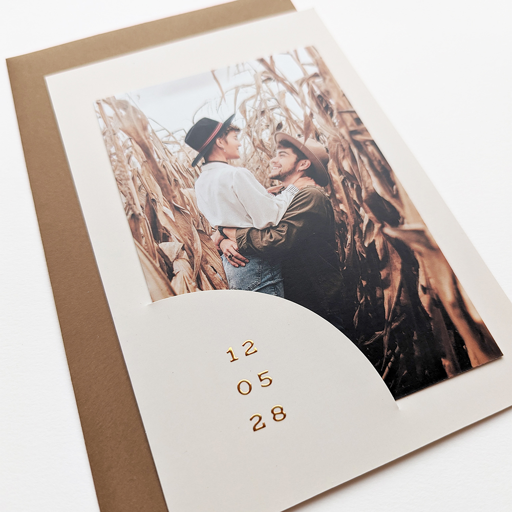 Foto trouwkaart met insteekkaartje en goudfolie