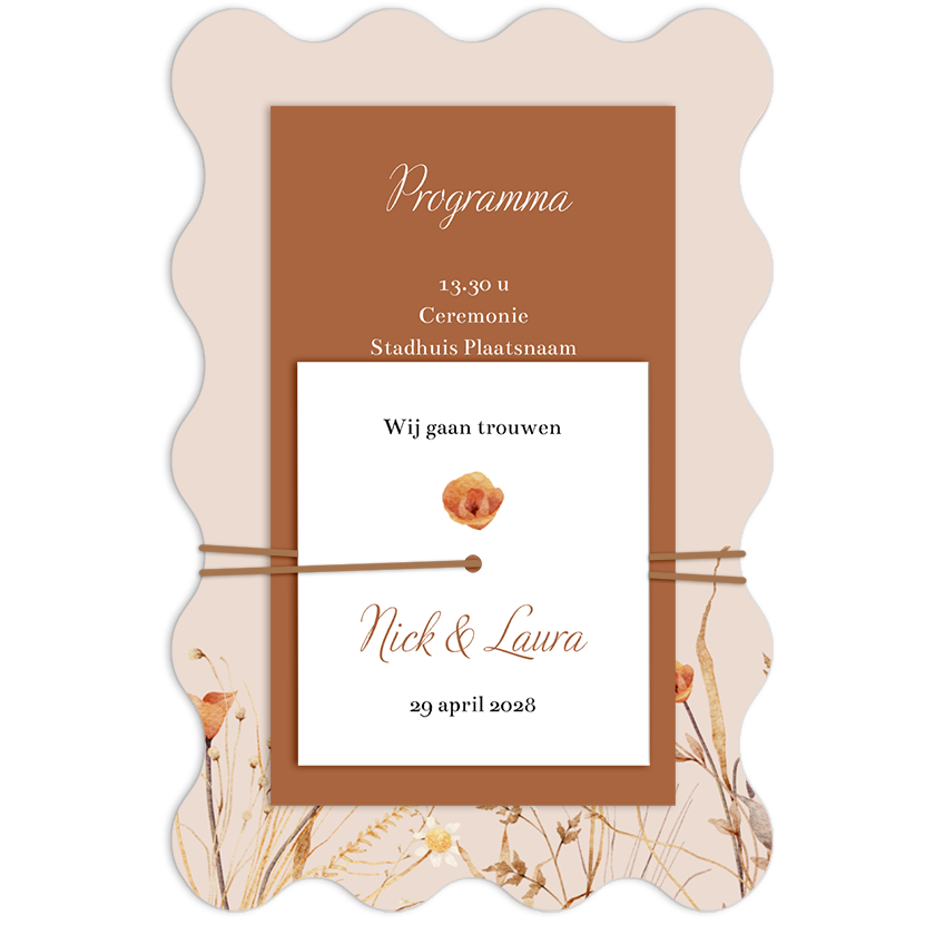 Gaan jullie komend jaar trouwen en ben je op zoek naar een originele uitnodiging voor je bruiloft? Deze hippe trouwkaart bestaat uit drie delen. De grote kaart in zachtroze heeft een opvallende golvende rand en klaprozen. Dan zijn er nog twee losse kaartjes, eentje met het programma en een met jullie namen. Achterop de grote kaart staat een mooie foto van jullie samen. Uiteraard kun je alles aanpassen in de editor.