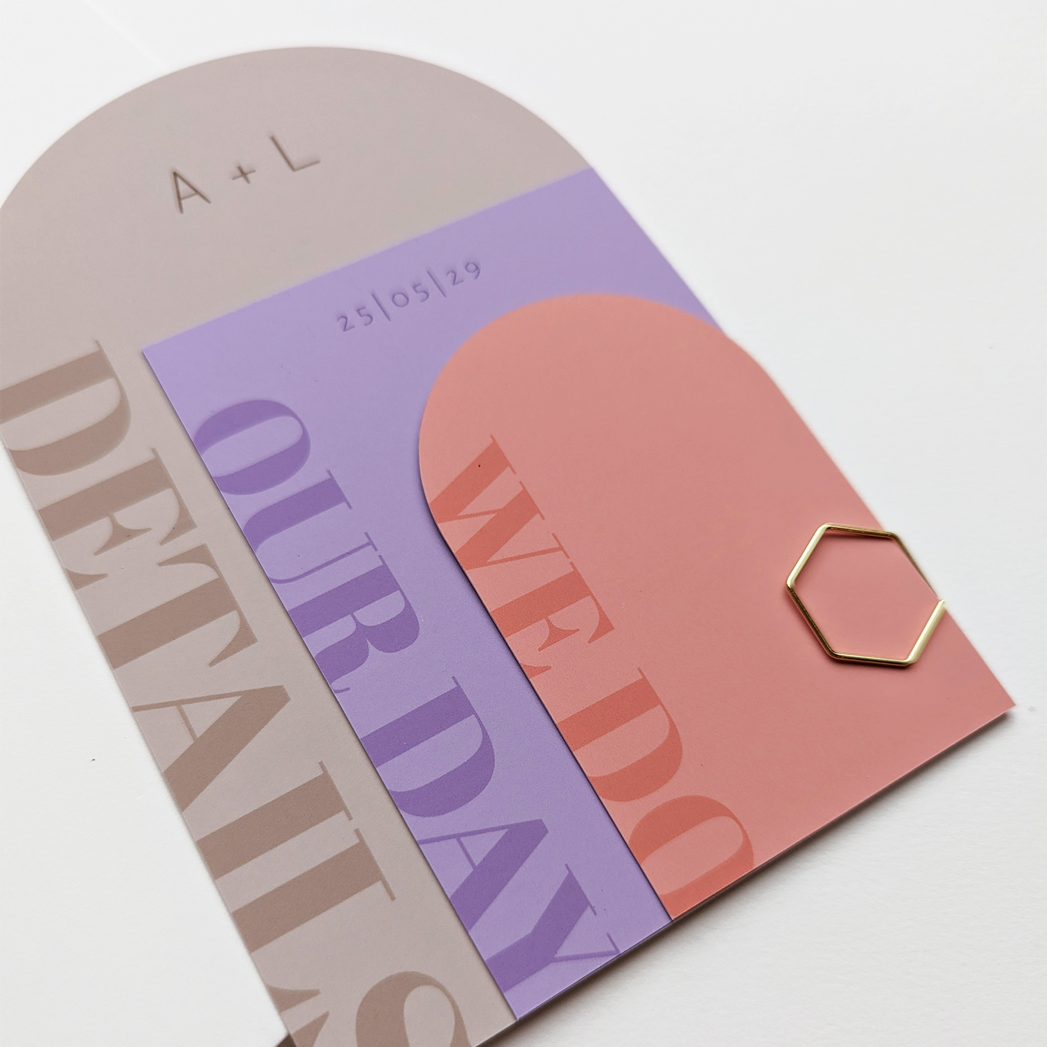 Pastel trouwkaart in drie lagen met opvallende typografie