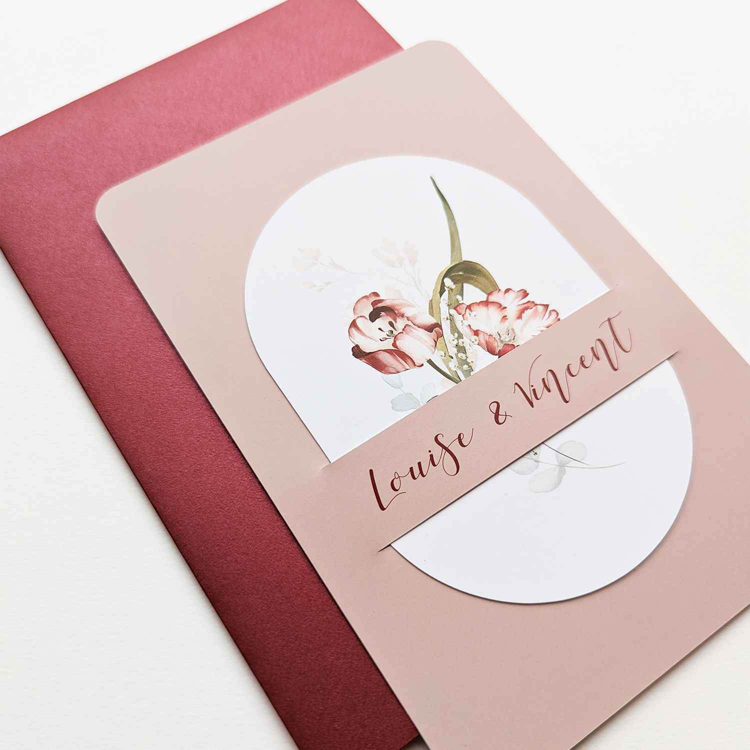 Deze prachtige trouwkaart bestaat uit twee delen. De grote, rechthoekige kaart in zachtroze en een wit, ovaal kaartje met geschilderde bloemen erop. Je kunt het ovale kaartje in de roze kaart steken, zo krijg je een originele uitnodiging voor jullie aankomende trouwdag. Pas de kleuren eventueel aan op het kleurenpalet van jullie bruiloft. De klassieke typografie past goed bij de sierlijke bloemen, maar je kunt uiteraard ook voor een strak lettertype kiezen.