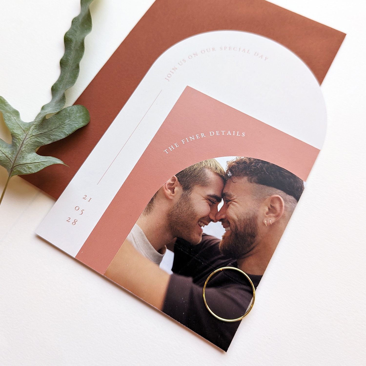 Bijzondere trouwuitnodiging met eigen foto en klassieke typografie. Deze uitnodiging bestaat uit drie losse kaartjes die heel mooi bij elkaar matchen. Op de grote, beige kaart komt de uitnodiging en de details over jullie bruiloft, op het roestoranje kaartje kun je jullie dagprogramma plaatsen en op het kleine halfronde kaartje is ruimte voor een mooie foto van jullie samen. Zo geef je je trouwkaarten een persoonlijke finishing touch. Stijlvol, warm en trendy: met deze trouwkaart zet je meteen de toon voor jullie grote dag!