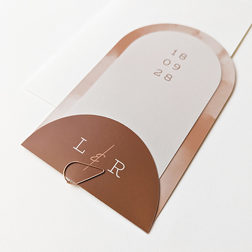 Trouwkaart met halfrond label in bruin en beige