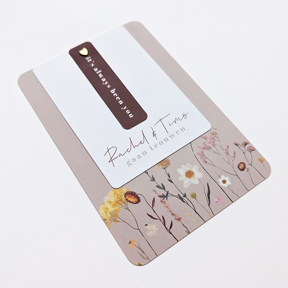 Mooie trouwkaart in zandkleur met droogbloemen en labels. Op de twee labels komen jullie namen en een quote te staan. Op de achterkant van het grotere kaartje kun je informatie over jullie trouwdag plaatsen. Pas dit ontwerp naar eigen smaak aan in onze ontwerptool en bevestig de labels aan het kaartje met een splitpen, touwtje of lintje.