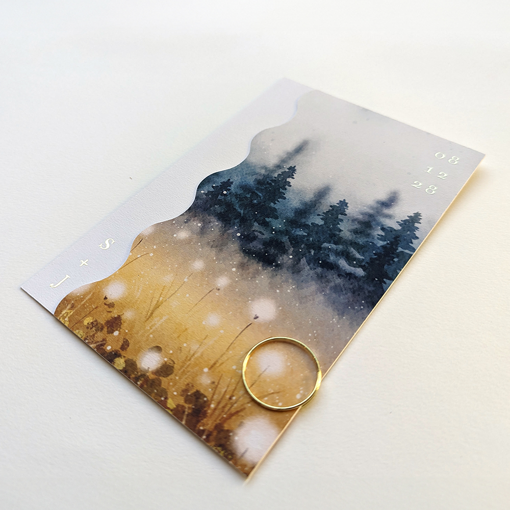 Originele trouwkaart bestaande uit twee delen. De achterste trouwkaart is een rechthoek. De voorste kaart heeft een golvende rand en is wat smaller dan de achterste kaart waardoor je een deel van deze kaart ziet. Op het voorste kaartje staat een mooie waterverf afbeelding van een winters landschap met heide, dennenbomen en sneeuwvlokjes. Op het achterste kaartje kun je de informatie over jullie trouwdag plaatsen.
