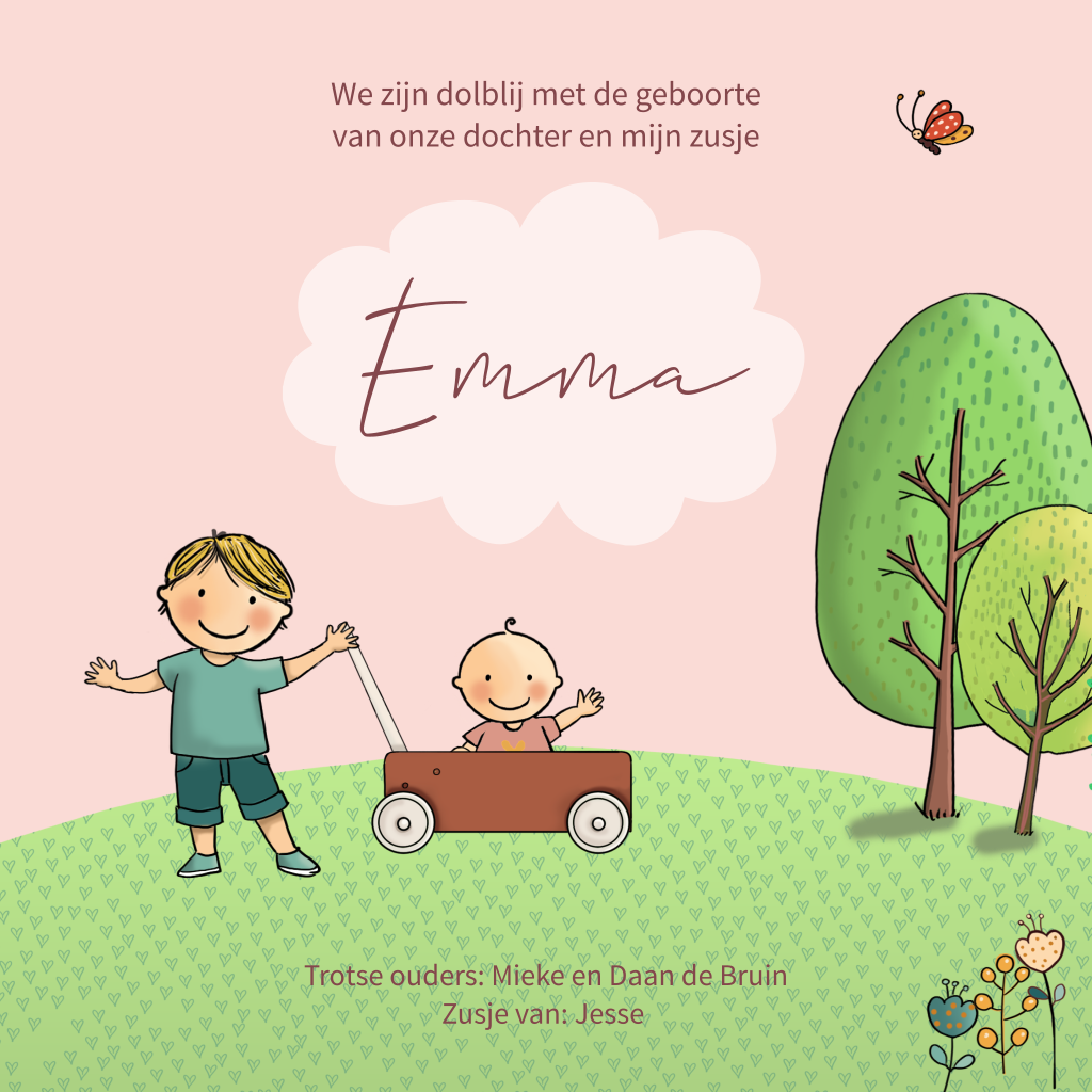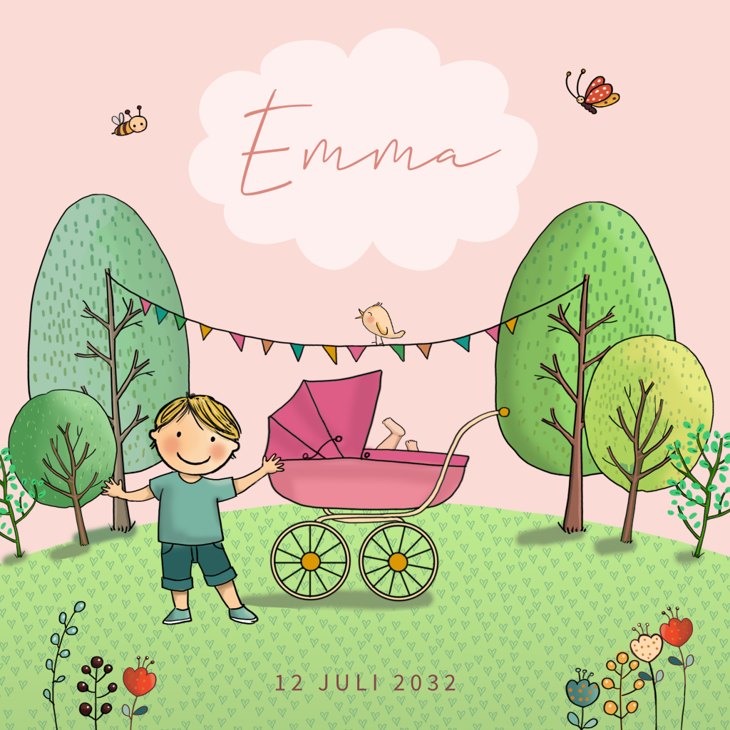 Geboortekaartje tweede kindje met grote broer met roze kinderwagen waar haar kleine zusje in ligt in fris groen landschap met bomen, bloemen en vlaggetjes.