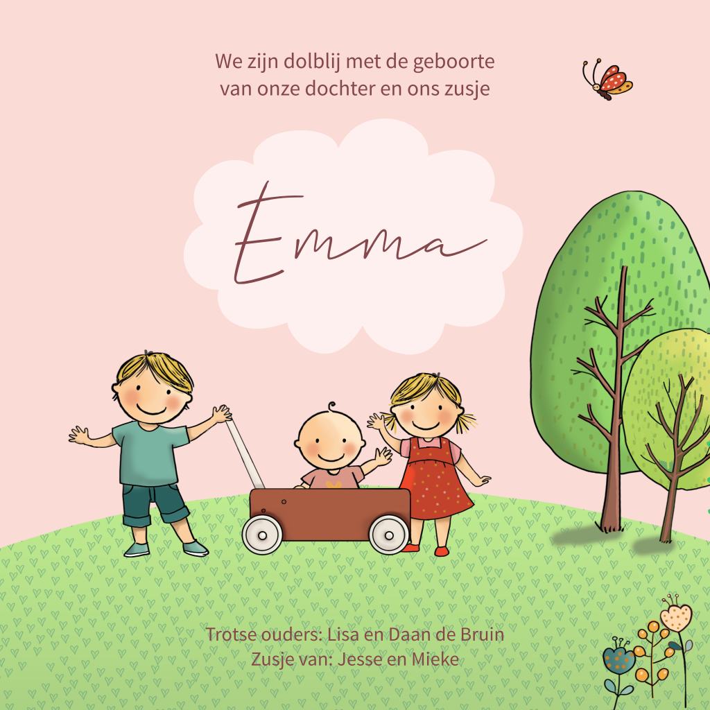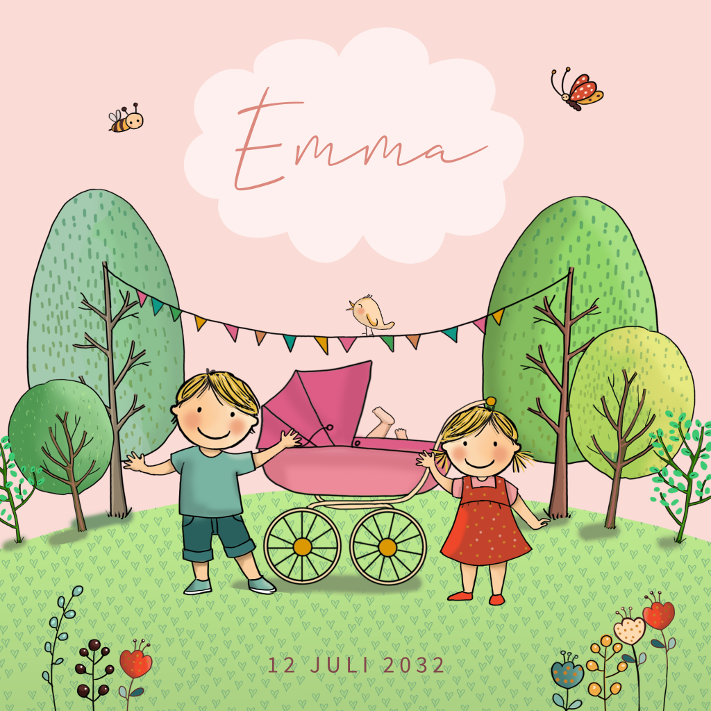 Geboortekaartje met kinderwagen in groen landschap met bomen, bloemen en vlaggetjes. De twee oudste meisjes staan bij de roze kinderwagen waar hun baby zusje in ligt.