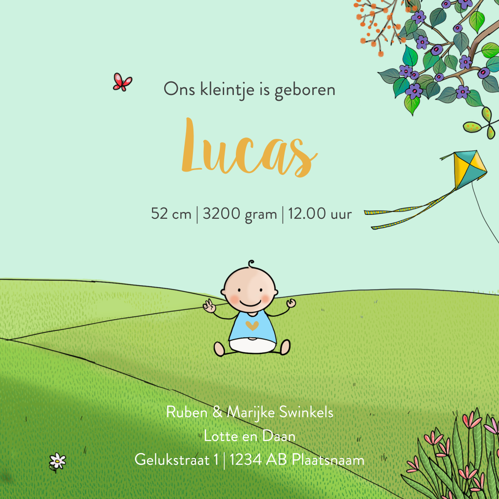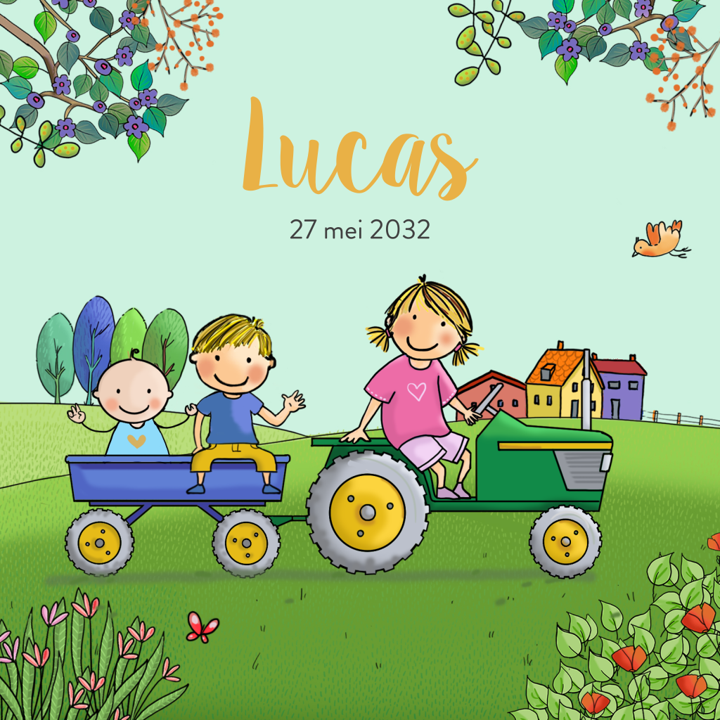Wordt er binnenkort een lief jongetje geboren? Dan is dit leuke geboortekaartje met groene tractor en drie kinderen misschien wel een goed idee. Pas de volgorde van de kinderen eenvoudig aan in de ontwerptool.