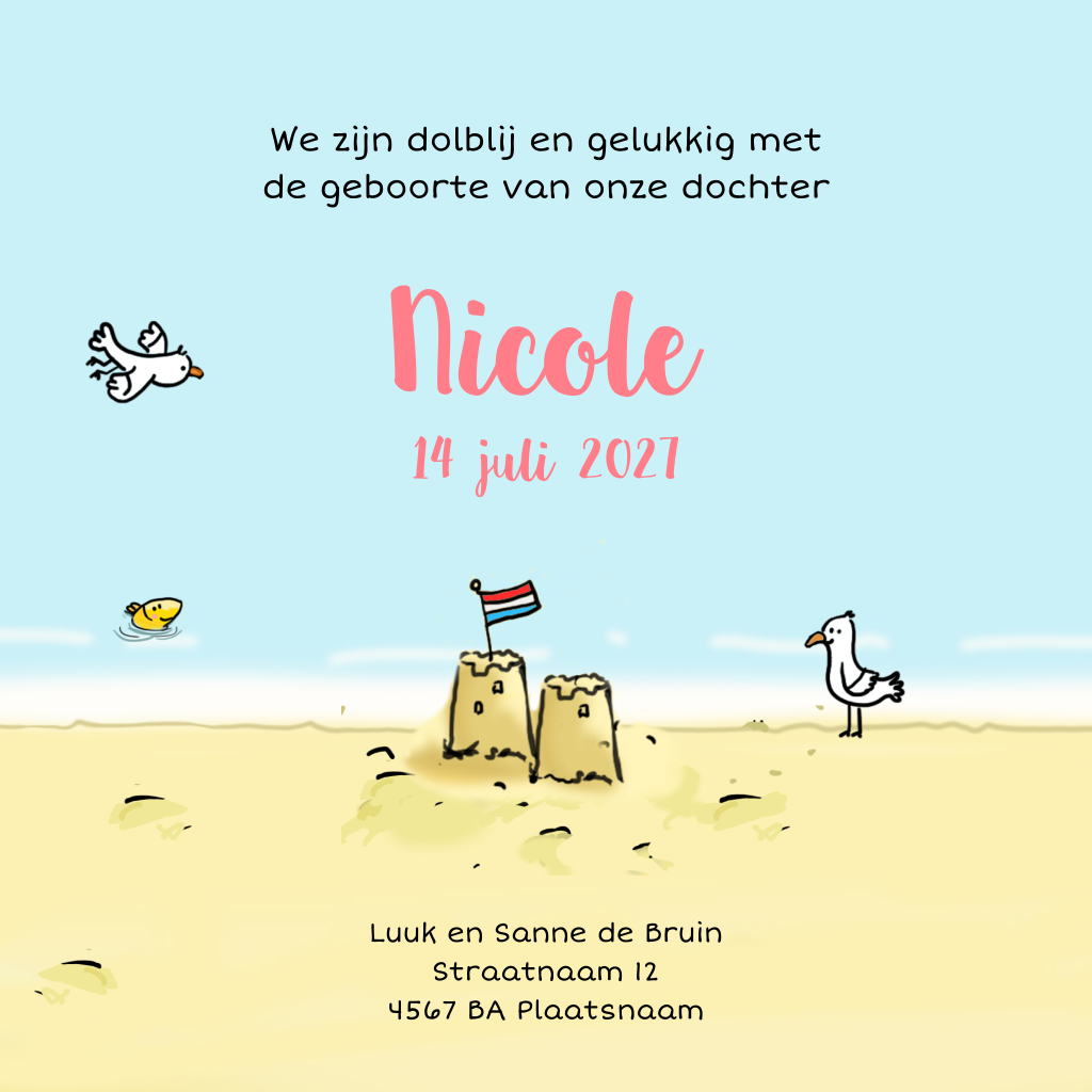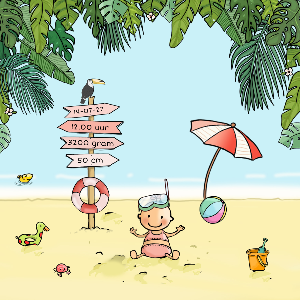 Ben je in verwachting van dochter verwacht je haar deze zomer? Kies dan voor een geboortekaartje met zomer, zon, zee en strand als thema. Op dit zomerse geboortekaartje zit het meisje op het strand in het zand. Op het pijlenbord staan de geboortegegevens. Pas zelf dit leuke meisjes geboortekaartje aan.