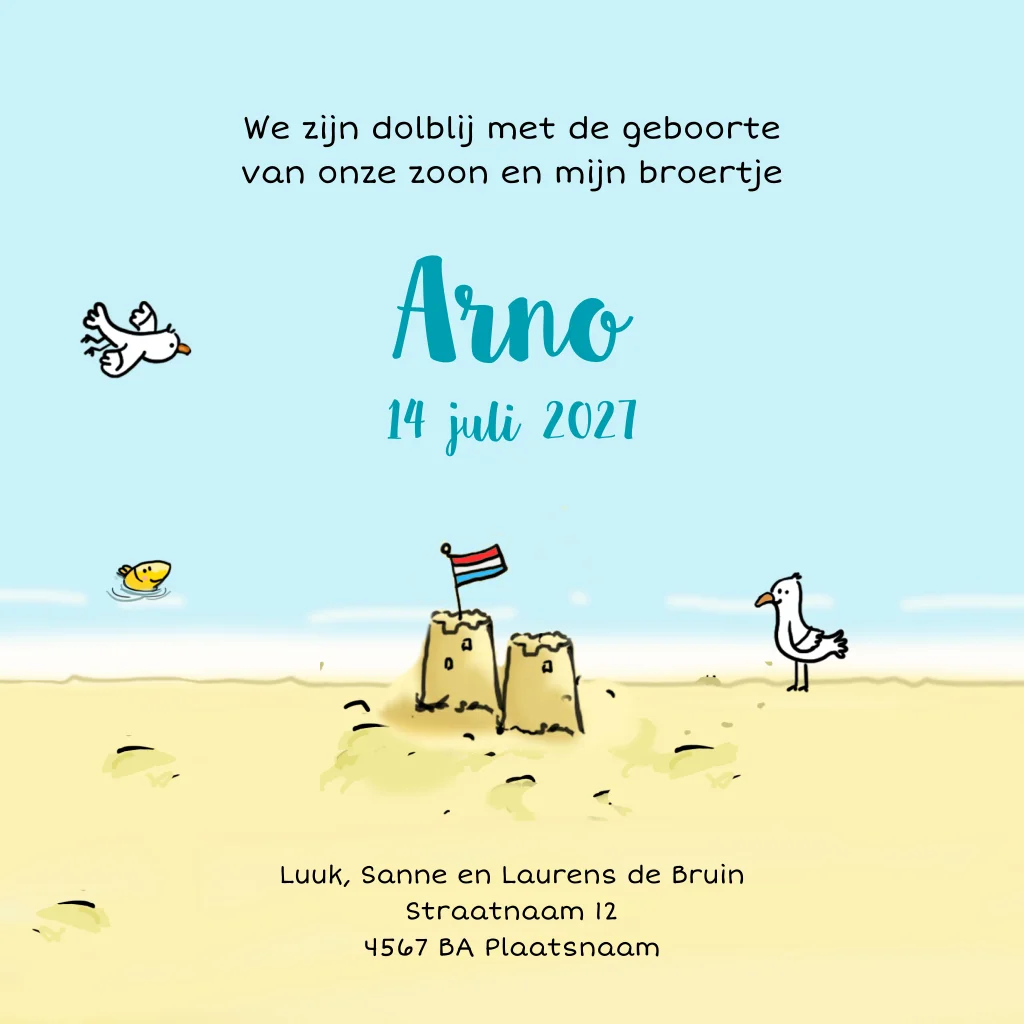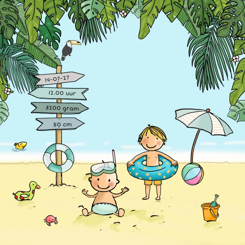 Ben je in verwachting van een 2e kindje, weer zoontje en verwacht je hem deze zomer? Kies dan voor een geboortekaartje met zon, zee en strand. Op dit geboortekaartje zit het baby jongetje op het strand in het zand. Zijn grote broer staat klaar om te gaan zwemmen. Op het pijlenbord staan de geboortegegevens. Pas zelf dit leuke jongens geboortekaartje aan.