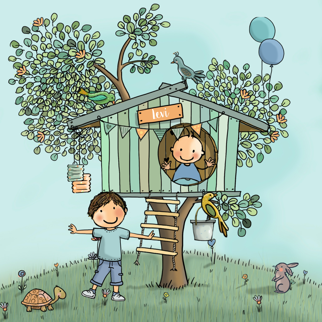 Ben je op zoek naar een kleurrijk geboortekaartje om je 2e kindje aan te kondigen? Dit geboortekaartje met grote broer en zijn baby broertje bij een leuke boomhut is perfect.