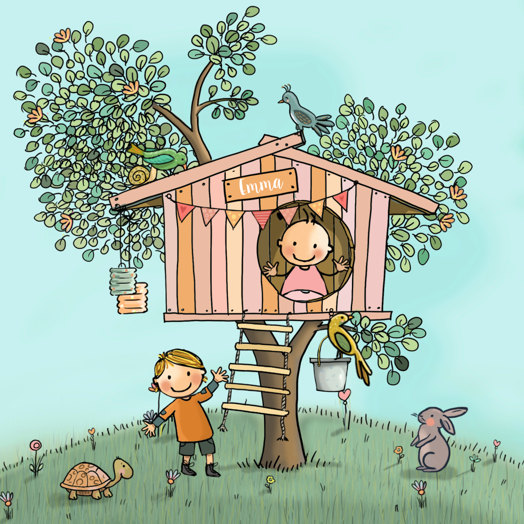 Prachtige geboortekaartje voor de komst van een 2e kindje. Grote broer staat met zijn baby zusje bij een leuke boomhut.