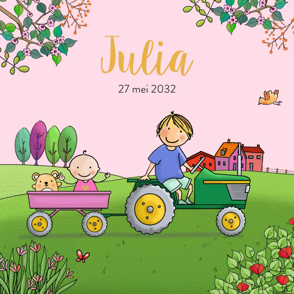 Is er een tweede kindje onderweg en wordt het een meisje? Dan is dit vrolijke geboortekaartje met grote broer voorop de groene tractor en zijn baby zusje in de kar erachter perfect.