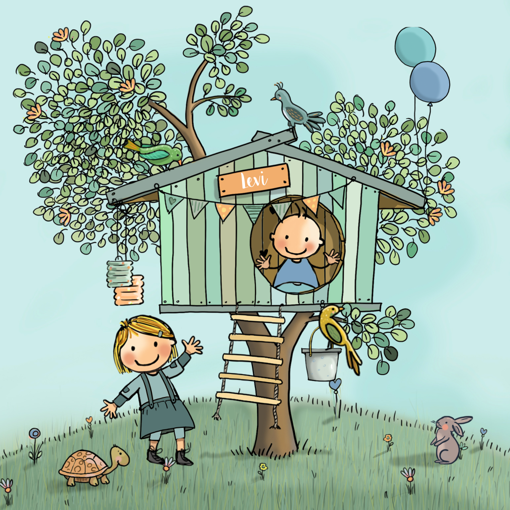 Ben je op zoek naar een vrolijk geboortekaartje om je 2e kindje aan te kondigen? Dit geboortekaartje met grote zus en haar baby broertje bij een leuke boomhut is perfect.
