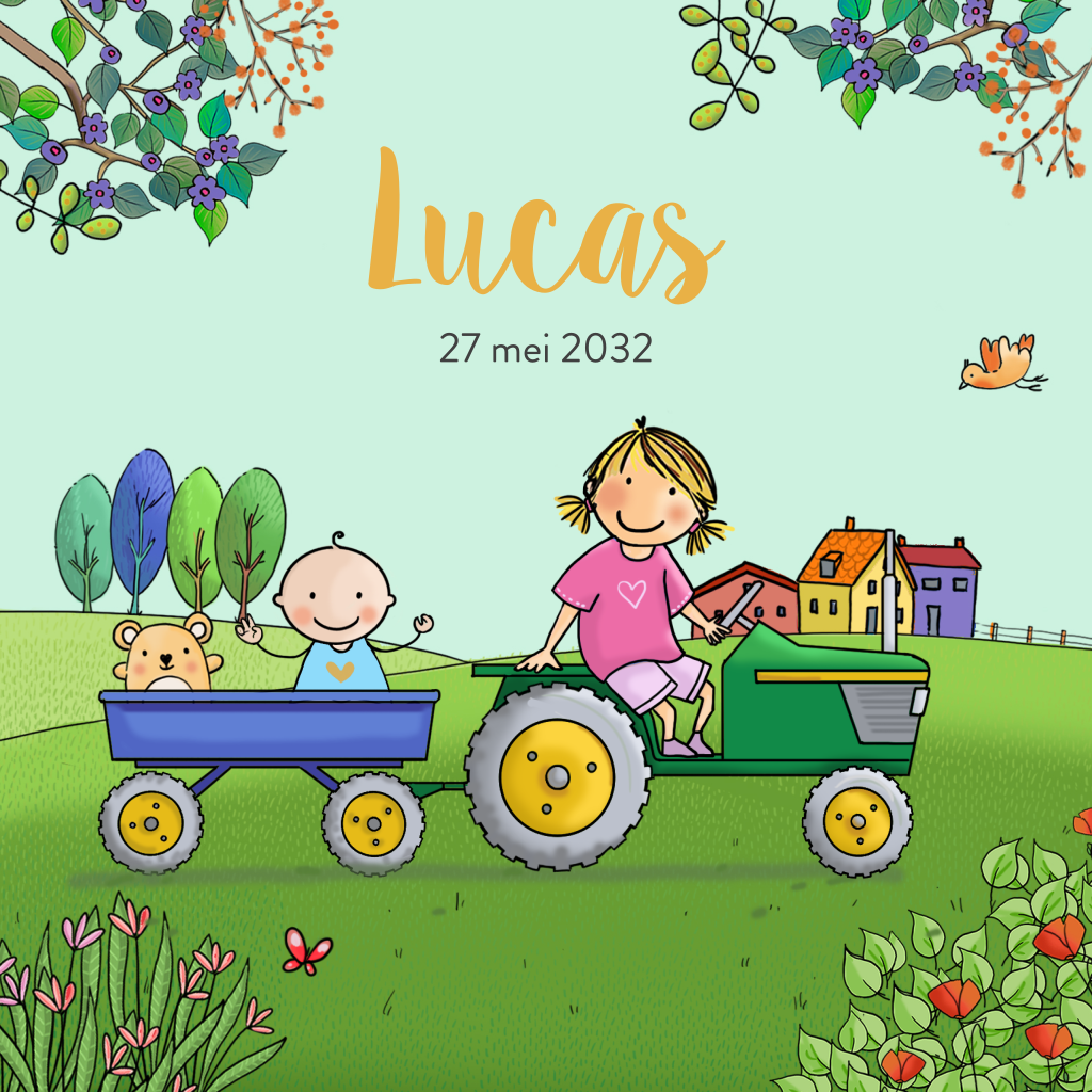 Wordt er binnenkort een tweede kindje geboren? Dan is dit leuke geboortekaartje met grote zus voorop de groene tractor en haar baby broertje in de kar erachter superleuk.