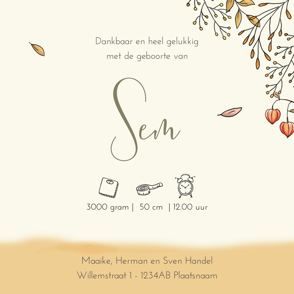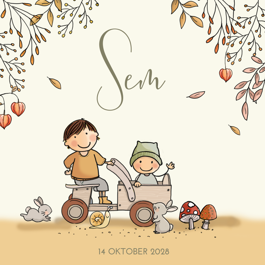 Hoera, er is een tweede zoon op komst! Hoe bijzonder is dat. Ben je uitgerekend in de herfst dan is dit geboortekaartje perfect voor jullie gezin. Allebei de zoontjes spelen een rol op dit herfst geboortekaartje. De oudste zoon zit op een houten kar met daarin zijn pasgeboren broertje.