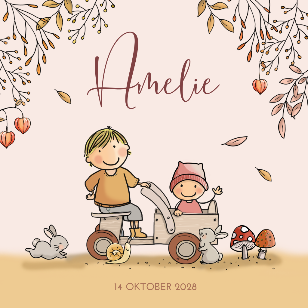 Hoera, er is een tweede kindje op komst! Hoe uniek is dat. Ben je uitgerekend in het najaar dan is dit geboortekaartje ideaal voor jullie gezin. Allebei de kinderen spelen een rol op dit herfst geboortekaartje. De oudste zoon zit op een houten kar met daarin zijn pasgeboren zusje. De kaart is opgemaakt in mooie herfstkleuren en je kunt alle teksten naar wens aanpassen.